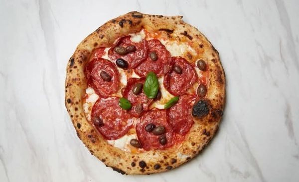 Tomato sauce, mozzarella, hot salami, kalamata olives
