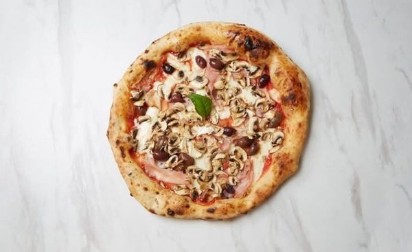 Tomato sauce, mozzarella, smoked ham, mushroom, olives