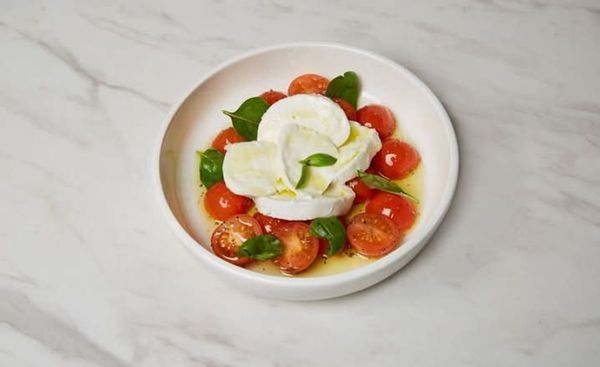 Layers of fresh tomato, burrata cheese, basil, oregano and oil of olive