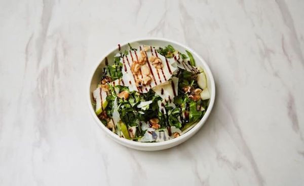 Wild rocket, balsamic glaze and shave parmesan, wallnuts + pear