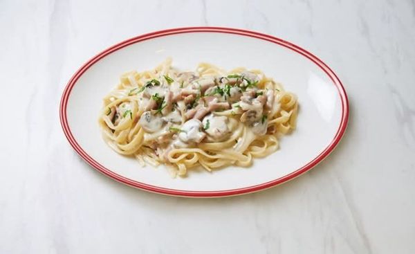 This delightful dish features a creamy sauce complemented by ham and mushrooms