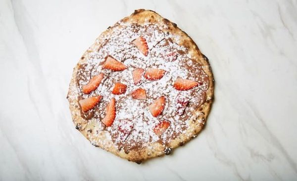 Pizza dough 11 inch. 6 Slices topped with Nutella choccolate and Strawberry ( PLEASE BE AWARE IT CONTAINS NUTS )