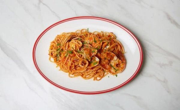 Spaghetti marinara, Red sauce, clams, Tiger prawns, calamari